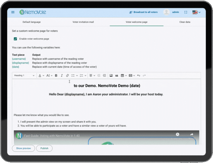 NemoVote is a professional voting platform for all requirements. It is optimized for real-time voting and offers an extremely flexible yet easy-to-understand system.